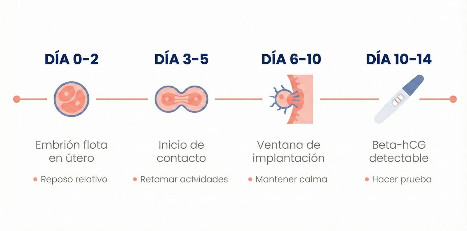 | Día 10-14 | La beta-hCG comienza a ser detectable | Síntomas variables o ninguno | Esperar hasta fecha indicada para beta-hCG |