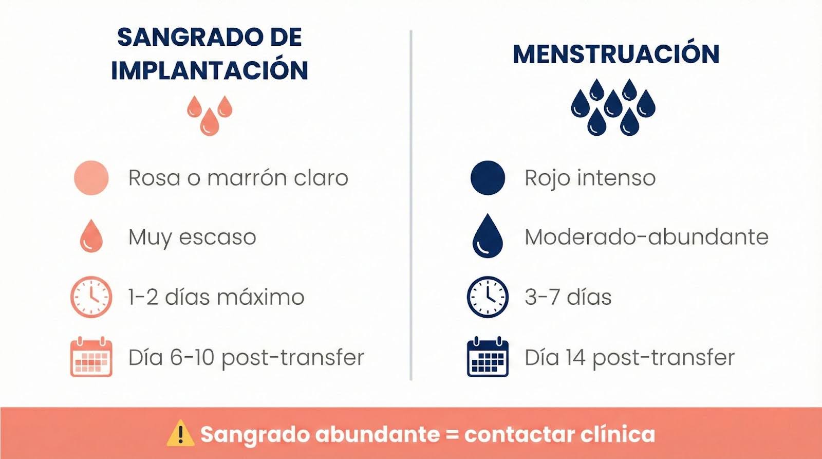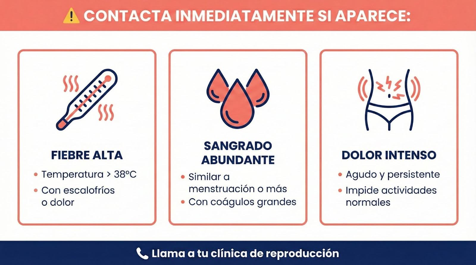 - Sangrado abundante: Si aparece un sangrado incontrolable parecido a una menstruación o más intenso, llama al centro de reproducción