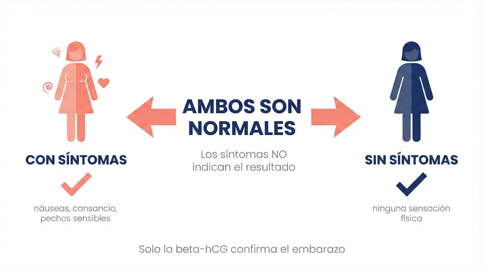 Tu resultado no depende de lo que sientas. Los síntomas del embarazo se producen principalmente por la elevación de la hCG, y en estos primeros días los niveles son muy bajos. La única forma de confirmar un embarazo es mediante el análisis de beta-hCG en sangre.